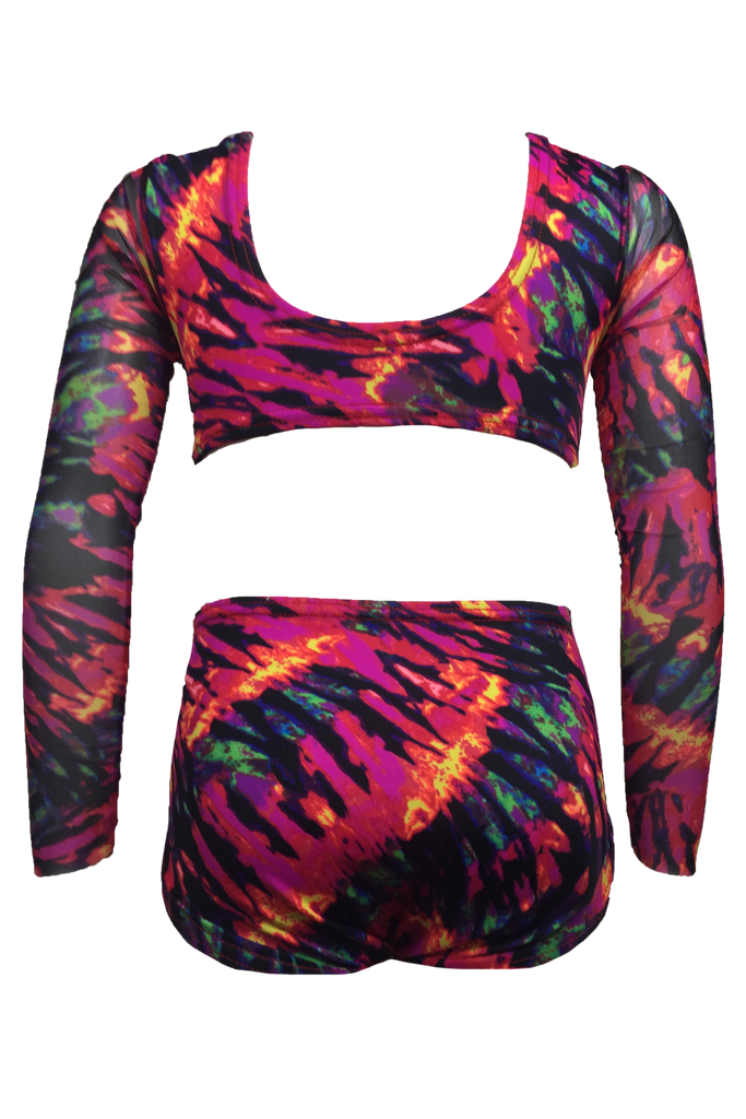 Description: Red, magenta and black tie dye printed 4-way stretch open back leotard with mesh long sleeves in matching print.